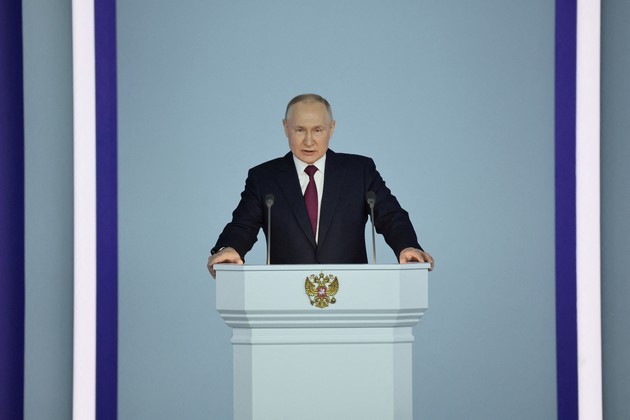 Putin al brindar su discurso anual ante las dos Cámaras del Parlamento tres días antes del primer aniversario de la invasión. Crédito: Reuters/Sputnik/Sergei Savostyanov