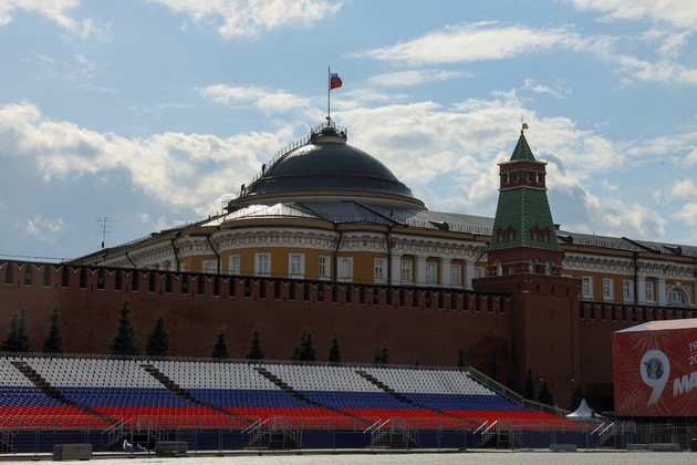 Personal trabajando sobre el domo del edificio del Senado en el Kremlin, ya con la infraestructura montada para el desfile del Día de la Victoria en Moscú. Crédito: Evgenia Novozhenin / Reuters