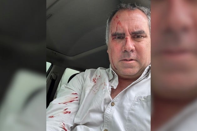 Rafael Belaúnde Llosa con con el rostro ensangrentado tras el ataque en Cerro Azul