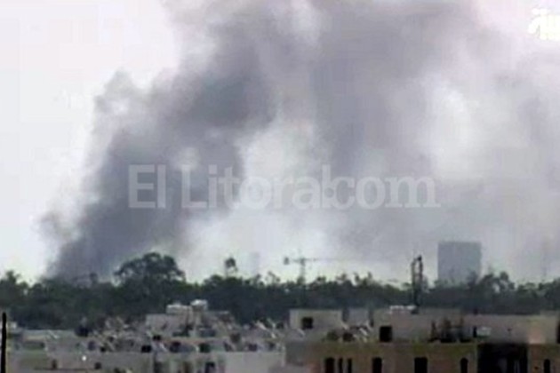 Ahora ascienden columnas de humo negro desde el complejo de Bab al Aziziya, que los rebeldes tomaron tras dos días de combates. La fachada de la residencia de Gadafi presenta numerosos impactos de disparos de armas de fuego, según mostraron las imágenes televisivas.