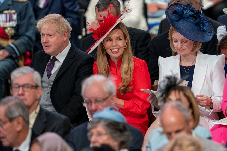 El primer ministro de Gran Bretaña, Boris Johnson, su esposa, Carrie Johnson, y la secretaria de Relaciones Exteriores, Liz Truss, asisten al Servicio Nacional de Acción de Gracias celebrado en la Catedral de San Pablo, durante las celebraciones del Jubileo de Platino de la Reina Isabel de Gran Bretaña, en Londres, Gran Bretaña, el 3 de junio de 2022. Foto: Reuters