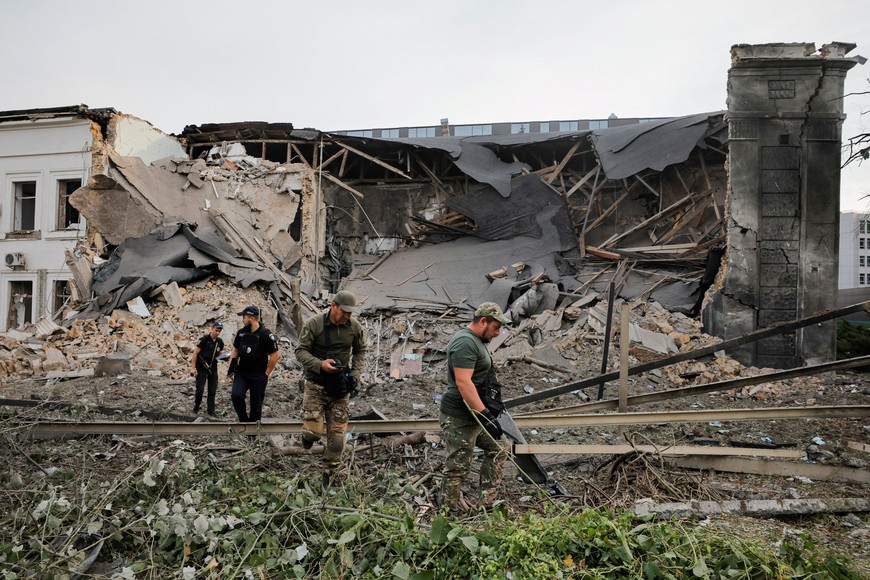 Los investigadores inspeccionan el lugar del ataque con misiles rusos en un edificio de oficinas, en medio del conflicto Rusia-Ucrania, en Kiev, Ucrania, el 2 de septiembre de 2024. REUTERS/Thomas Peter