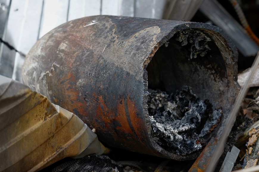 La parte delantera de un misil Kh-101 se ve entre los escombros de un complejo deportivo de una universidad dañado durante un ataque ruso, en medio del conflicto Rusia-Ucrania, en Kiev, Ucrania, el 2 de septiembre de 2024. REUTERS