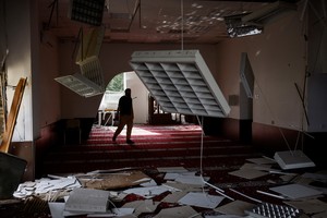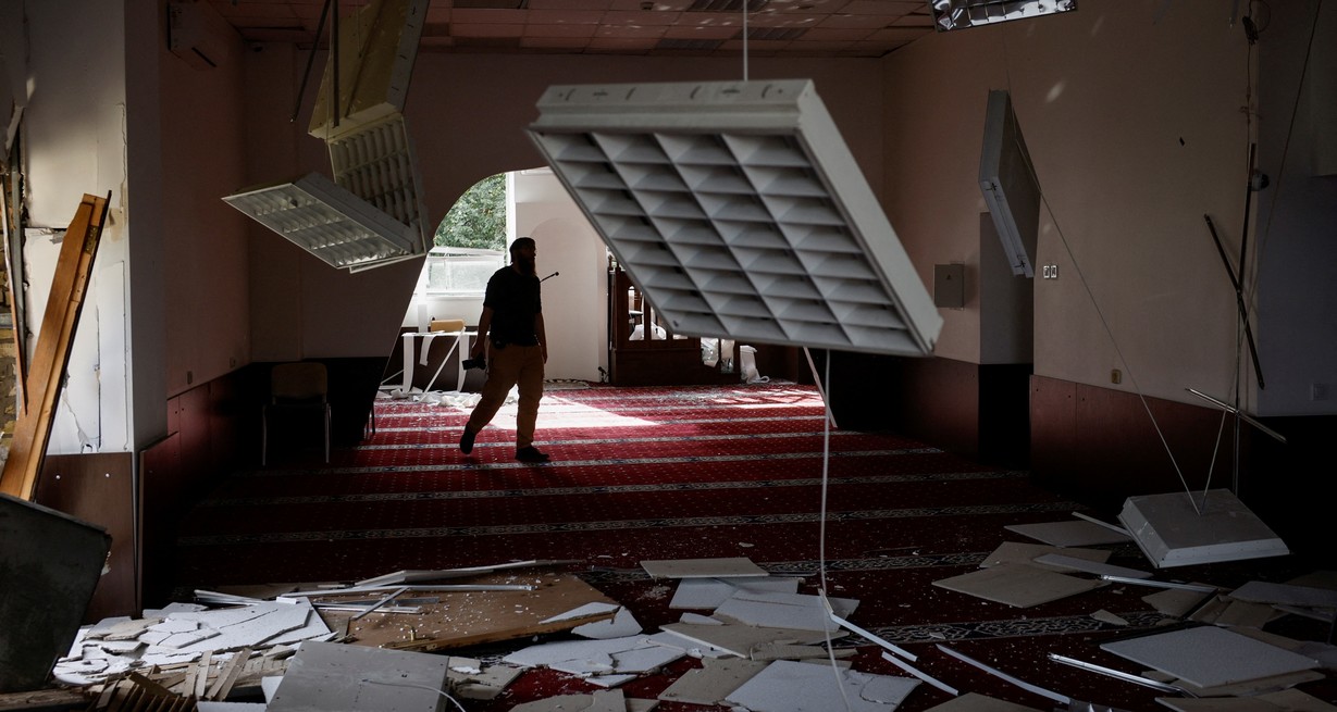 Un miembro de la comunidad musulmana inspecciona la mezquita de la Asociación de Musulmanes de Ucrania, dañada por un ataque con misiles rusos que destruyó el edificio vecino, en medio del conflicto Rusia-Ucrania, en Kiev, Ucrania, el 2 de septiembre de 2024. REUTERS