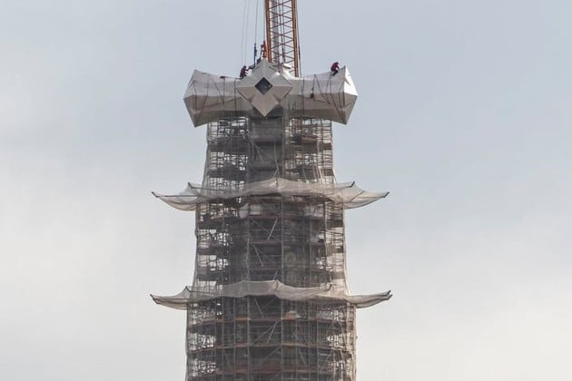 Con la cruz ya completa, la torre de Jesucristo se acerca a su configuración definitiva. Una vez terminada, la estructura alcanzará 17 metros de altura y 13,5 metros de ancho. El núcleo central permitirá el acceso interno mediante una escalera y se apoya sobre una base decorada con inscripciones en latín, en sintonía con otras partes del templo.