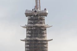 Los trabajadores colocan el brazo superior en la cruz de la torre de la basílica de Jesucristo. REUTERS/Nacho Doce
