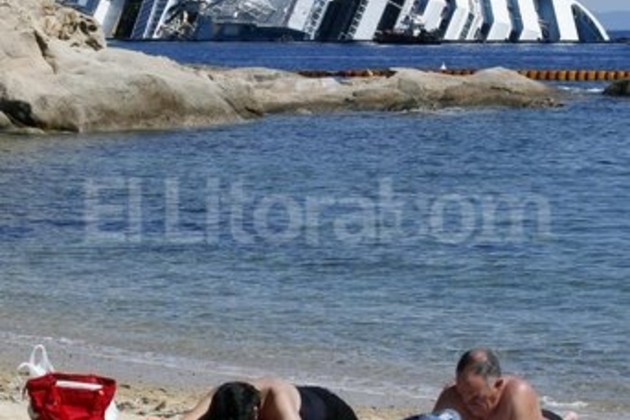 Una extraña postal se da por estos días en las costas de la isla de Giglio, Italia. Los turistas disfrutan del sol y la playa a metros del lugar donde el crucero Costa Concordia quedó semihundido el 13 de enero de este año.
