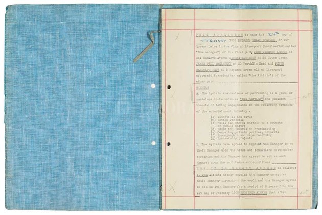 El primer contrato firmado por The Beatles y su representante Brian Epstein, que impulsó su éxito internacional tras ‘descubrirlos‘ en The Cavern Club de Liverpool, se subasta por internet a través de la casa Sotheby’s de Londres, en una puja que concluye el martes.