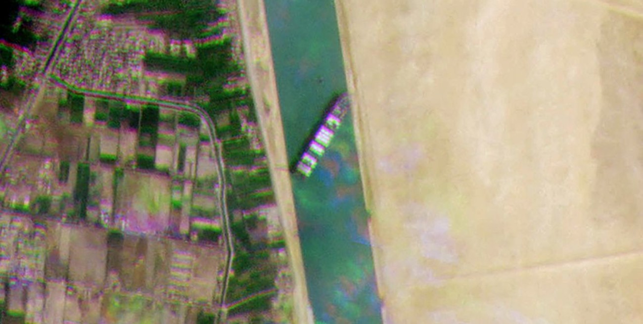 Gentileza A satellite handout image released by Planet Labs Inc on March 24, 2021, shows the Taiwan-owned MV 'Ever Given' (Evergreen) container ship, a 400-metre- (1,300-foot-)long and 59-metre wide vessel, lodged sideways and impeding all traffic across the waterway of Egypt's Suez Canal. - A giant container ship ran aground in the Suez Canal after a gust of wind blew it off course, the vessel's operator said on March 24, 2021, bringing marine traffic to a halt along one of the world's busiest trade routes. (Photo by - / Planet Labs / AFP) / RESTRICTED TO EDITORIAL USE - MANDATORY CREDIT "AFP PHOTO / PLANET LABS " - NO MARKETING - NO ADVERTISING CAMPAIGNS - DISTRIBUTED AS A SERVICE TO CLIENTS
