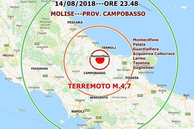 El sismo se registró a las 20:19 horas a una profundidad de cuatro kilómetros, indicó la agencia sismológica nacional. Tuvo su epicentro en Montelcifone, en la provincia de Campobasso, y se sintió también en Roma, Nápoles y Bari.