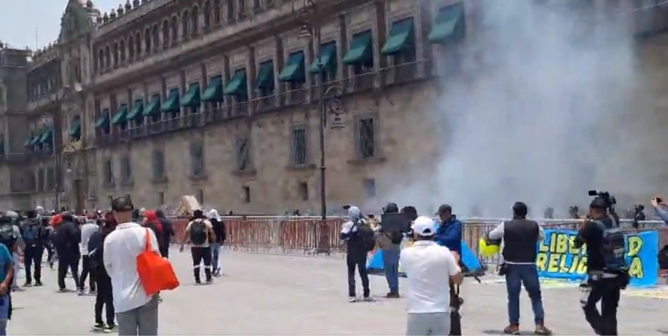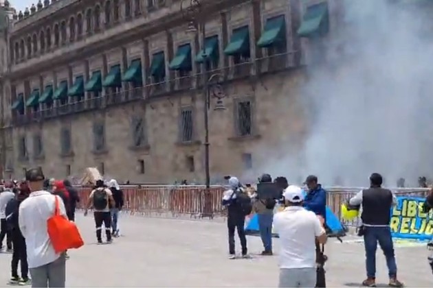 Un grupo de estudiantes normalistas de Ayotzinapa tiraron petardos este lunes contra la fachada del Palacio Nacional en Ciudad de México, sede del Ejecutivo del país.
