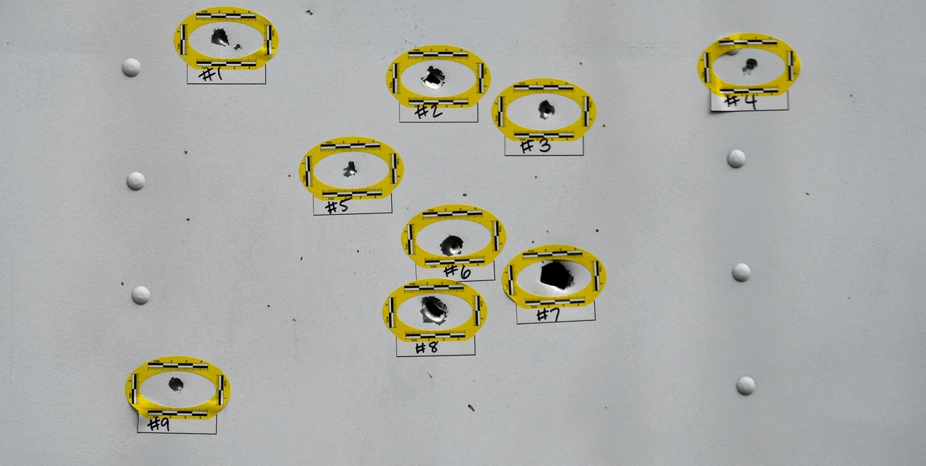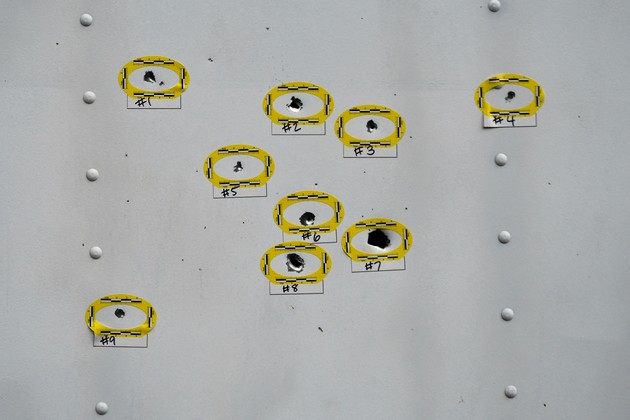 Los agujeros de bala encontrados en el costado de un camión estacionado, marcados mientras los oficiales de policía trabajaban en la escena el día después de un tiroteo en la sección de Kingsessing en el suroeste de Filadelfia, Pensilvania, EE. UU. 4 de julio de 2023. Foto: Reuters.