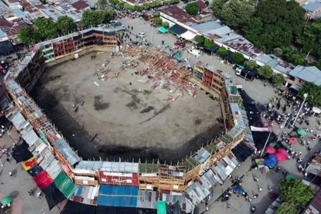 Las dramáticas imágenes compartidas en redes sociales muestran una enorme porción del palco de madera, lleno de espectadores, caer sobre la plaza de arena localizada dentro del departamento de Tolima.