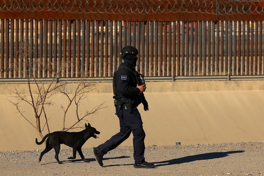 La Guardia Nacional de México y del Ejército mexicano patrullan cerca de un cruce fronterizo.