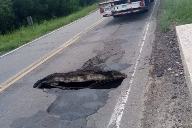 En la BR 290 cerca de Sao Gabriel cedió el pavimento y se formó un cráter de proporciones importantes. Las autoridades locales prohibieron el paso de tránsito pesado y controlaban la zona.
