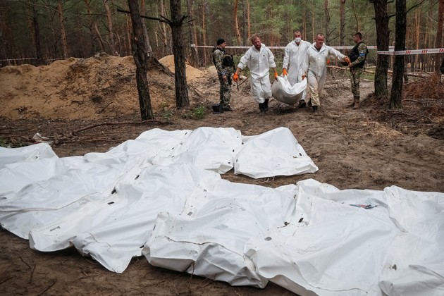 Una zona boscosa de Izium, localidad al noreste de Ucrania recientemente recuperada de manos rusas por las tropas locales, se ha convertido ya en otro de los grandes símbolos de la masacre de las tropas de Rusia en Ucrania. Más de 200 cruces de madera, algunas numeradas, señalaban en el bosque la existencia de un enterramiento masivo de víctimas de la guerra. Hasta ahora se han encontrado más de 440 cuerpos. Entre las primeras exhumaciones se han encontrado niños, familias enteras, según el presidente ucranio, Volodímir Zelenski. También personas con signos de tortura, las manos atadas a la espalda, e indicios que indican muerte por disparos, fuego de artillería o explosiones de minas. “El mundo entero debería ver esto”, ha alertado este viernes el dirigente. Ya hay abierta una investigación, con participación internacional, para obtener los detalles de esas muertes que recuerdan a escenas ocurridas en otras ciudades como Mariupol, en el sur de Ucrania, o Bucha, en los alrededores de Kiev, y que Zelenski considera sin ambages crímenes de guerra.