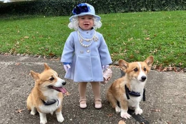 La emoción provino de una idea real que la familia tuvo en Halloween. Jalayne, de dos años, se vistió de la cabeza a los pies con ropa para parecerse a la reina Isabel II en su disfraz de Halloween. Desde un conjunto de chaqueta y sombrero azul claro a juego, hasta una peluca blanca y perlas, Jalayne se parecía a la reina. Y el atuendo se completó con los corgis de la familia, Rascal y Jack.