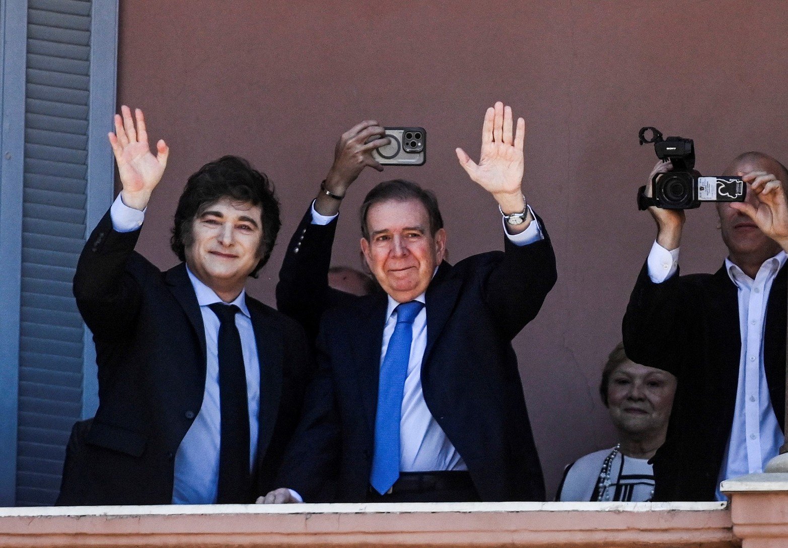 4 / 8 Milei y González Urrutia salieron a saludar al balcón de la Casa Rosada. Foto: Mariana Nedelcu