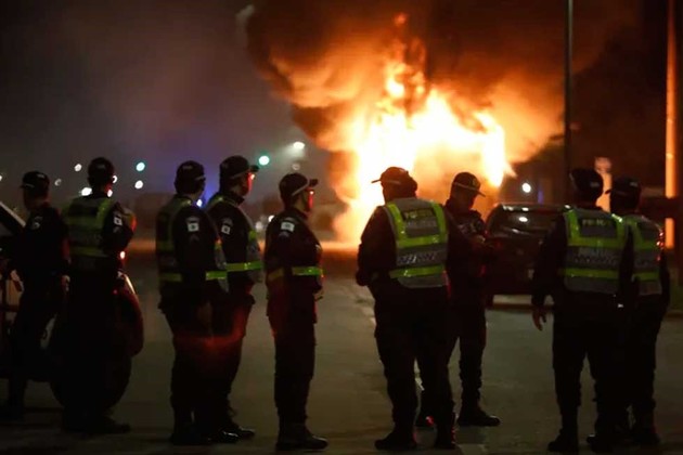 Los uniformados respondieron disparando granadas de aturdimiento y gases lacrimógenos para dispersar a la multitud, en tanto que los autobuses y automóviles cercanos fueron incendiados.