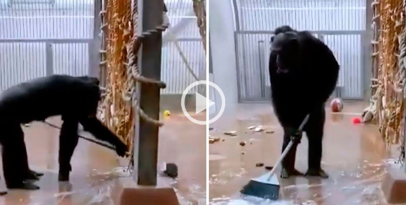 Un curioso video se hizo viral, luego de que filmaran a un chimpancé limpiando el piso y los vidrios de su jaula con una escoba.