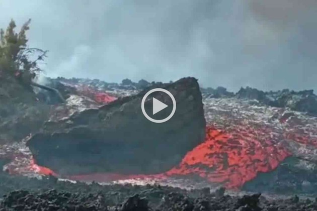 Un equipo de geólogos del Instituto Geológico y Minero de España (IGME-CSIC) captó el 19 de octubre el deslizamiento de un gigantesco bloque flotando en medio de una lengua de lava que fluía a su vez sobre otra colada procedente de la parte más septentrional del volcán de Cumbre Vieja.