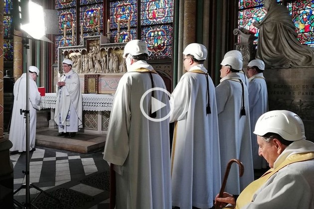 Como una muestra del estado en que quedó la Catedral, el arzobispo de París, Michel Aupetit, ofició la misa con un casco blanco. ‘La catedral sigue viva, porque celebramos la eucaristía‘, dijo Aupetit, al comienzo de la ceremonia en que la que se recuerda la fiesta de la Dedicatoria, una de las más importantes para Notre Dame ya que se festeja su inauguración religiosa.