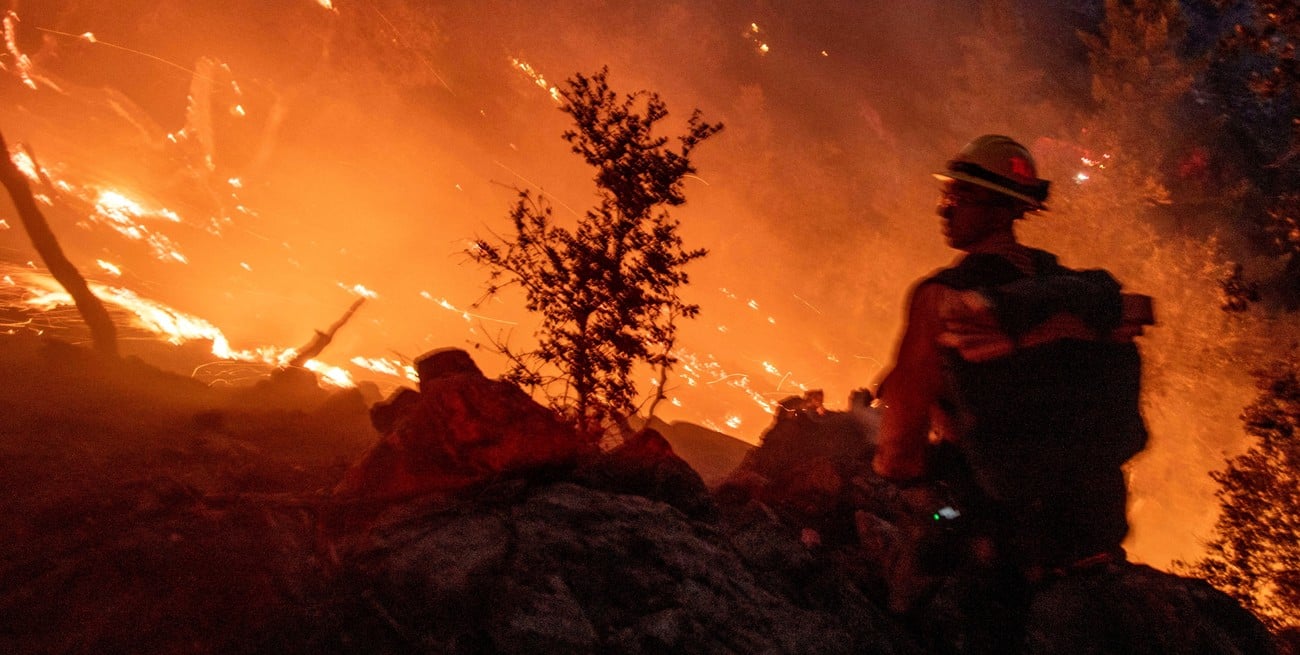 El fuego arrasa lo que encuentra a su paso. Pérdidas millonarias en uno de los sectores más exclusivos de Norteamérica. Trabajo de bomberos a destajo por cielo y tierra.