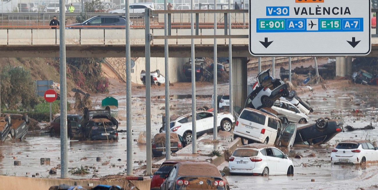 Las pilas de autos abandonados en las calles de Valencia y su área de influencia se convirtieron en las imágenes del desastre. Según fuentes oficiales, la cifra de muertos se elevó a 92 y podría haber más.