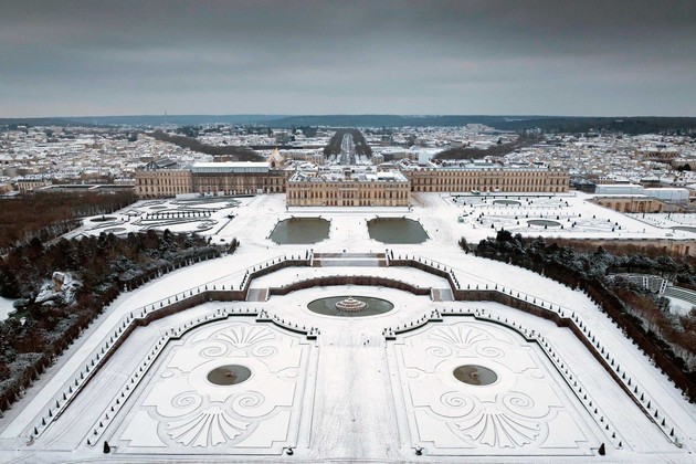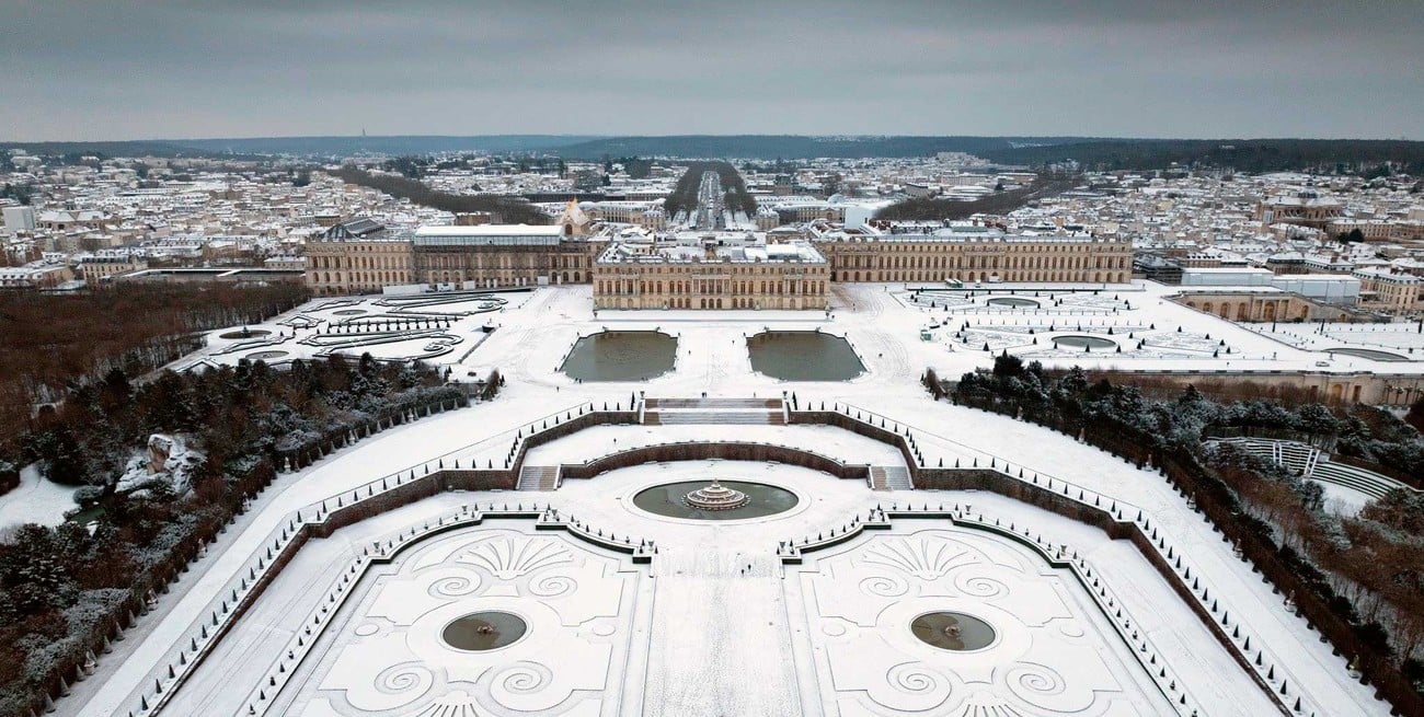 Las imágenes fueron publicadas por la cuenta oficial del Palacio en redes sociales. "Versalles bajo nieve", postearon en inglés y francés junto con fotos y videos tomados desde un drone.