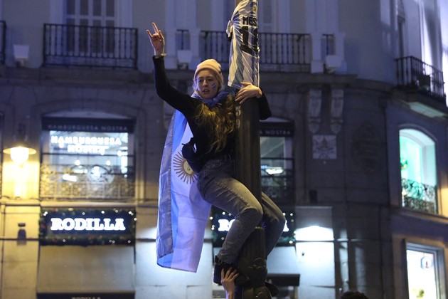 Unos 8.000 hinchas identificados con camisetas y banderas de la Argentina se reunieron en el centro de la capital española para celebrar el triunfo ante Francia que le dio al equipo de Lionel Messi la tercera Copa del Mundo para el fútbol argentino.