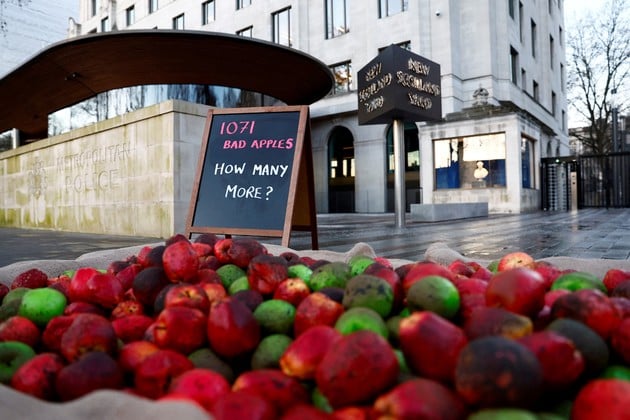 Miles de "manzanas podridas" fueron arrojadas este viernes frente a la sede de la Policía Metropolitana de Londres (Met) conocida como New Scotland Yard, como parte de una protesta de la organización benéfica de mujeres Refuge para poner de relieve las denuncias de abuso que involucran a oficiales de la fuerza.