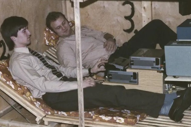 Dos empleados de la Stasi probando un puesto de observación portátil.