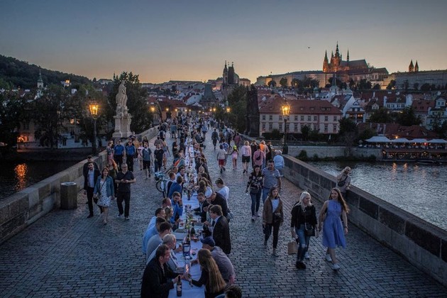 Con una larga mesa de 515 metros en el el famoso puente Carlos de Praga, República Checa festejó el "fin de la crisis por coronavirus".