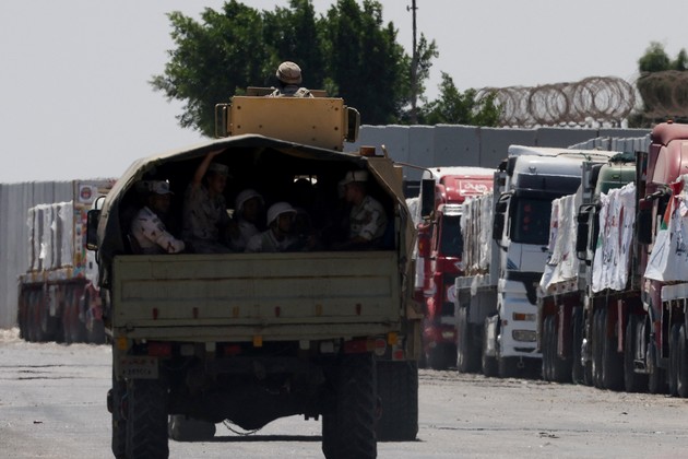 La gente espera mientras los camiones que transportan ayuda humanitaria se alinean cerca del cruce fronterizo. Créditos: Amr Abdallah Dalsh/Reuters