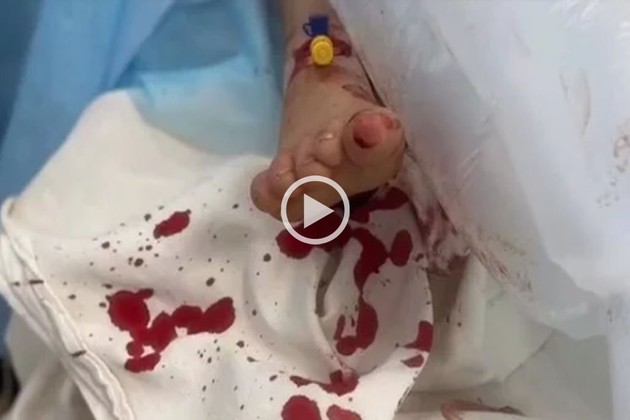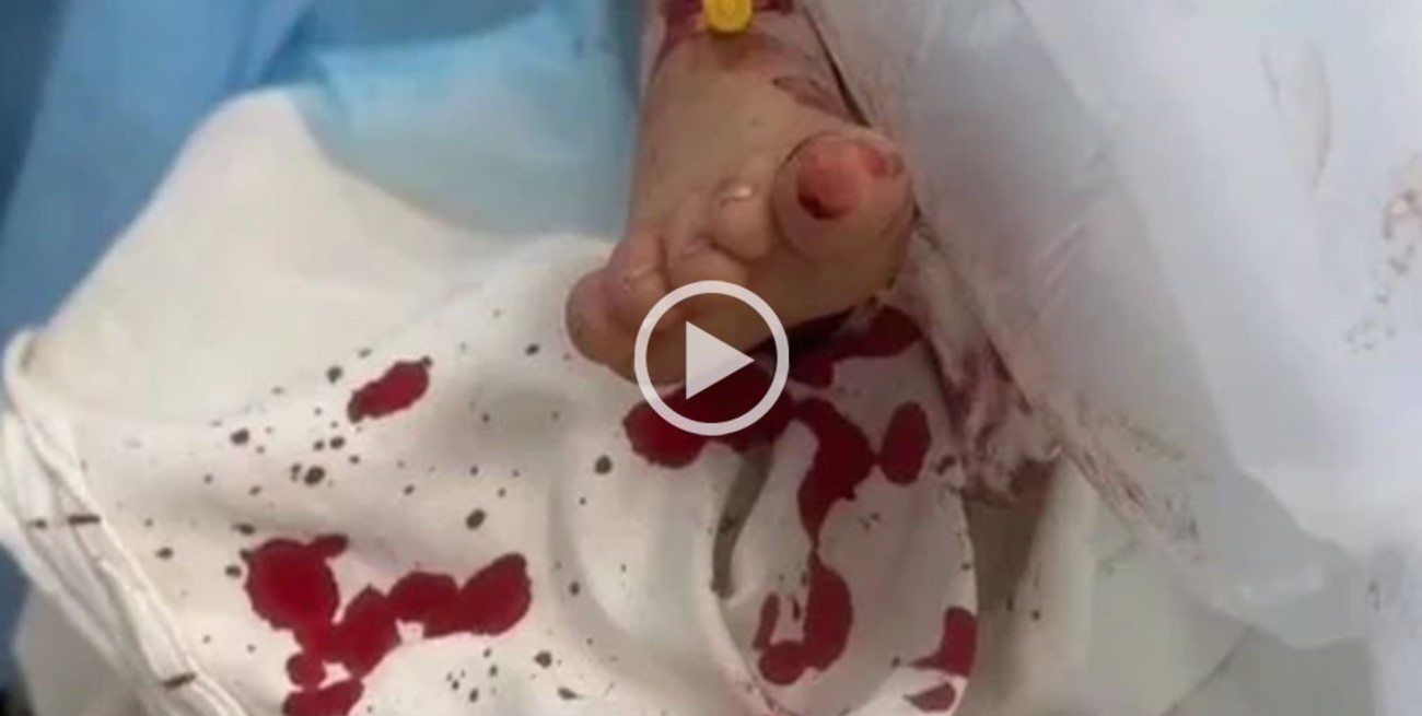 Luego se suceden las imágenes del horror: un bebé recibiendo RCP en la calle tras un ataque, edificios arrasados, ciudades en ruinas, juegos infantiles devastados. Todo con su respectiva inscripción. "Asesinato de niños, destrucción de ciudades enteras, bombardeo de juegos infantiles, lanzamiento de misiles a refugiados, crímenes masivos, robos de bienes, (difusión de) mentiras descaradas a todo el mundo", se lee en pantalla.