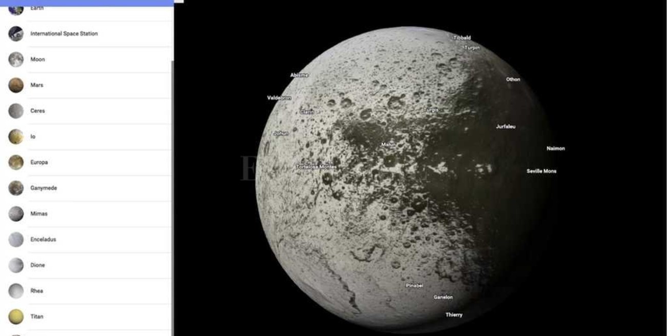 Los planetas y las lunas se despliegan en un menú vertical ubicado a la izquierda de la pantalla, y al cliquear sobre ellos se puede recorrer (desde una vista aérea) y observar detalles.