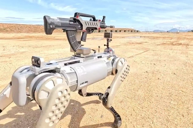 En dos de los videos compartidos se puede observar a la herramienta comportarse como un arma de artillería, con un rifle montado en su “lomo”. También desplegaron un rifle automático montado debajo de un dron aéreo de seis rotores, a modo de presentación de la serie de armas no tripuladas.