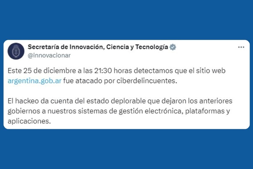 Desde la Secretaría de Innovación, Ciencia y Tecnología indicaron que el hackeo "da cuenta del estado deplorable que dejaron los anteriores gobiernos a nuestros sistemas de gestión electrónica, plataformas y aplicaciones".