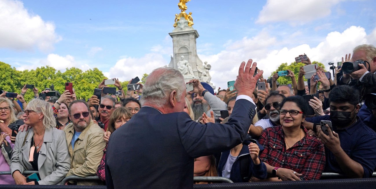 Carlos III saludó una por una a las personas que se agolparon a su paso en el Palacio de Buckingham tras la muerte de la reina Isabel II y una persona rompió el protocolo al besarlo.
