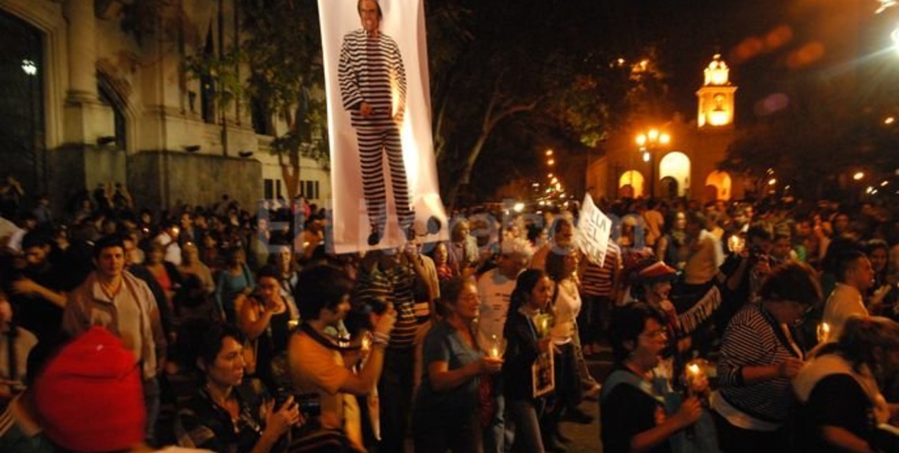Lo mismo fue para Graciela García de la Marcha de las Antorchas que llegó hasta la puerta de Tribunales, vela en mano, con una figura del ex gobernador Carlos Reutemann luciendo la característica vestimenta presidiaria Como estandarte. “Son 10 años de haber estado en la calle y no haber bajado los brazos en el reclamo de justicia”, pronunció emocionada Graciela García.