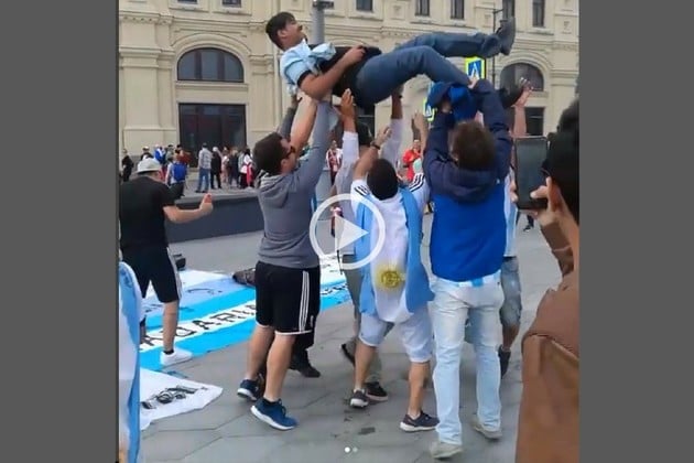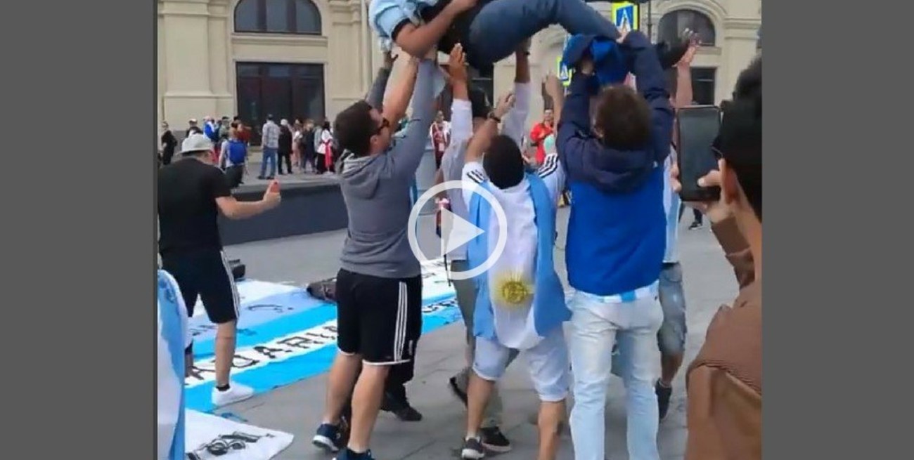 En las imagenes, se puede ver como una persona pone dinero dentro de la gorra y los argentinos lo hacen parte de un pogo al ritmo de "vamos vamos Argentina, vamos vamos a ganar..."