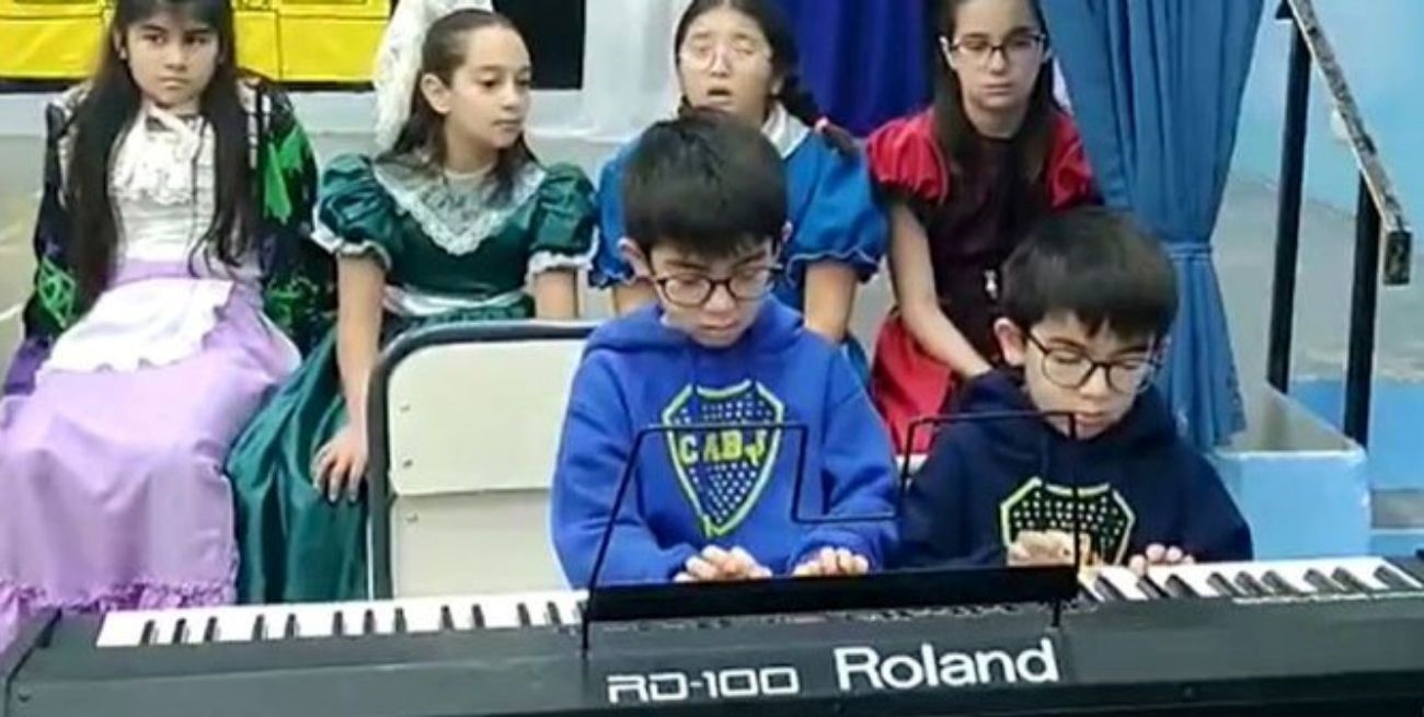Francisco y Blas Calderón tienen 8 años, son estudiantes de la escuela N° 197 de Comodoro Rivadavia y sorprendieron con su talento para tocar el piano y representar el Himno Nacional Argentino para esperar el 9 de Julio.