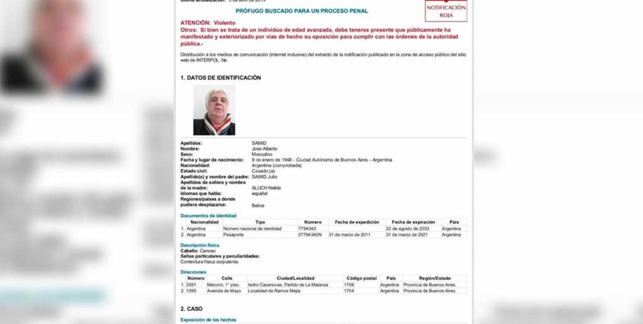 Una circular roja solicitada por Argentina fue emitida hoy por Interpol para la detención de José Alberto Samid, a quien se considera una persona "violenta" que se opone a cumplir las órdenes de la autoridad pública.