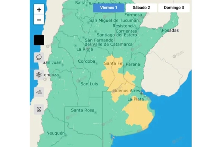 De esta manera, el SMN mantenía un alerta amarillo que rige este viernes para zonas de las provincias de Santa Fe, Buenos Aires; Córdoba y Entre Ríos.