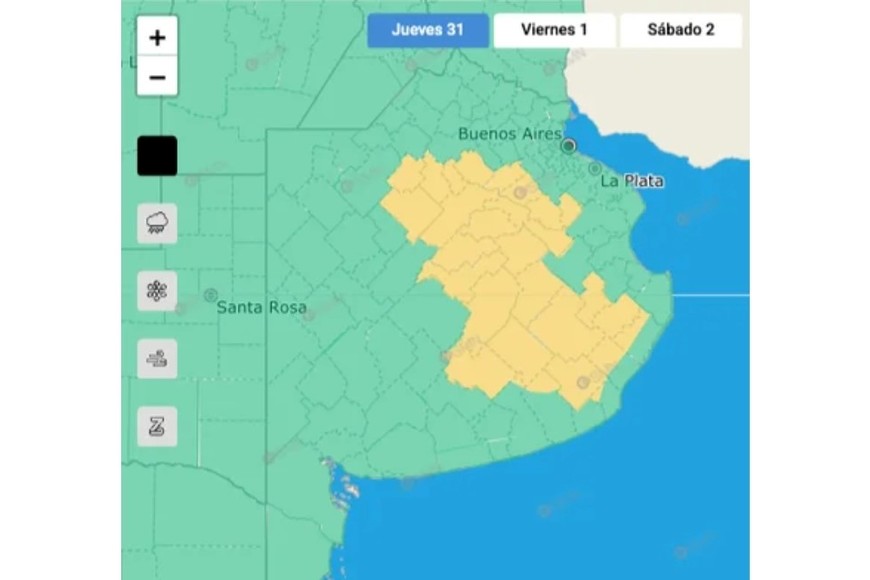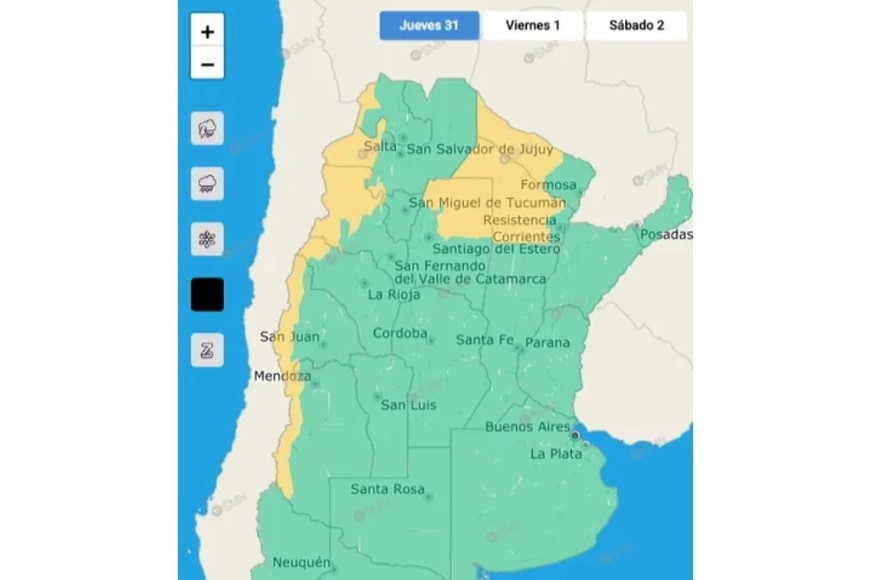 Se trata de un alerta amarillo que sigue en zonas de las provincias Jujuy, Salta, Catamarca, La Rioja, San Juan y Mendoza, en regiones de la cordillera; y en áreas de Santiago del Estero, Chaco y Formosa.