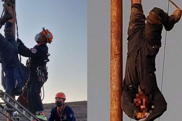 El medio ADNSUR relató que desde la Comisaría de Rada Tilly advirtieron que fue un grupo de trabajadores petroleros quienes divisaron la maniobra de este hombre y luego cómo éste colgaba con su pie desde un poste con mucha altura.