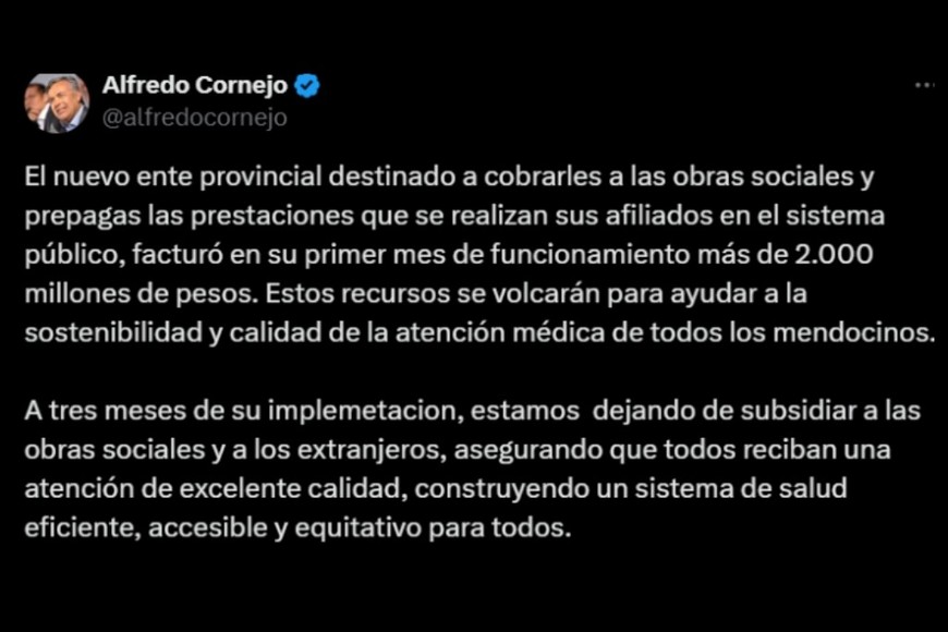 Cornejo celebró en X que Salud cobró más de $2.000 millones por servicios médicos prestados en efectores públicos a extranjeros no residentes y personas con obras sociales