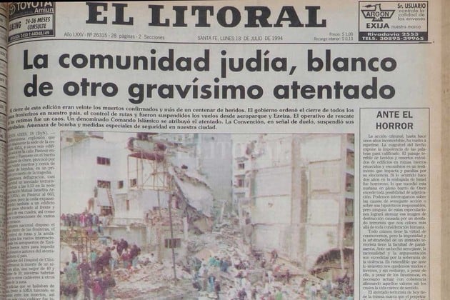 En aquella jornada trágica, diario El Litoral tituló: “La comunidad judía, blanco de otro gravísimo atentado”. En la bajada de la tapa de aquel lunes 18 de julio de 1994, este diario publicaba: “El gobierno ordenó el cierre de todos los pasos fronterizos en nuestro país, el control de rutas y fueron suspendidos los vuelos desde Aeroparque y Ezeiza”. “Un denominado Comando Islámico se atribuyó el atentado”, agregaba.