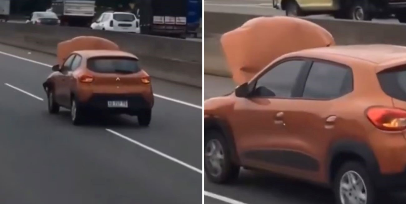 Otro automovilista registró el momento con su teléfono celular en el que se ve cómo la involucrada manejaba su Renault Kwid naranja con el capot levantado, lo que le tapaba completamente la visibilidad y que podría haber causado un siniestro vial.-.