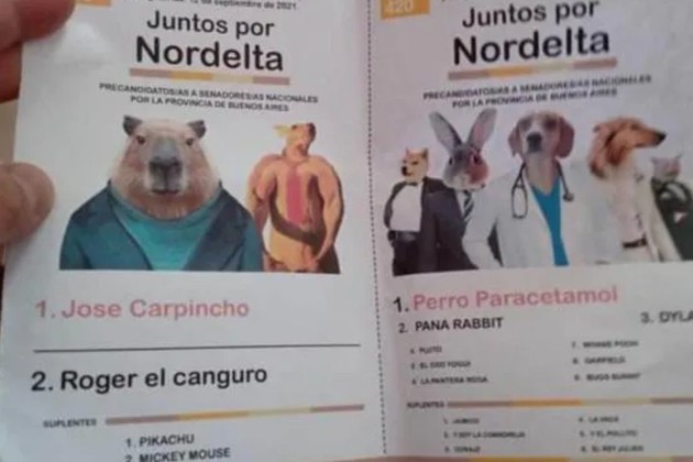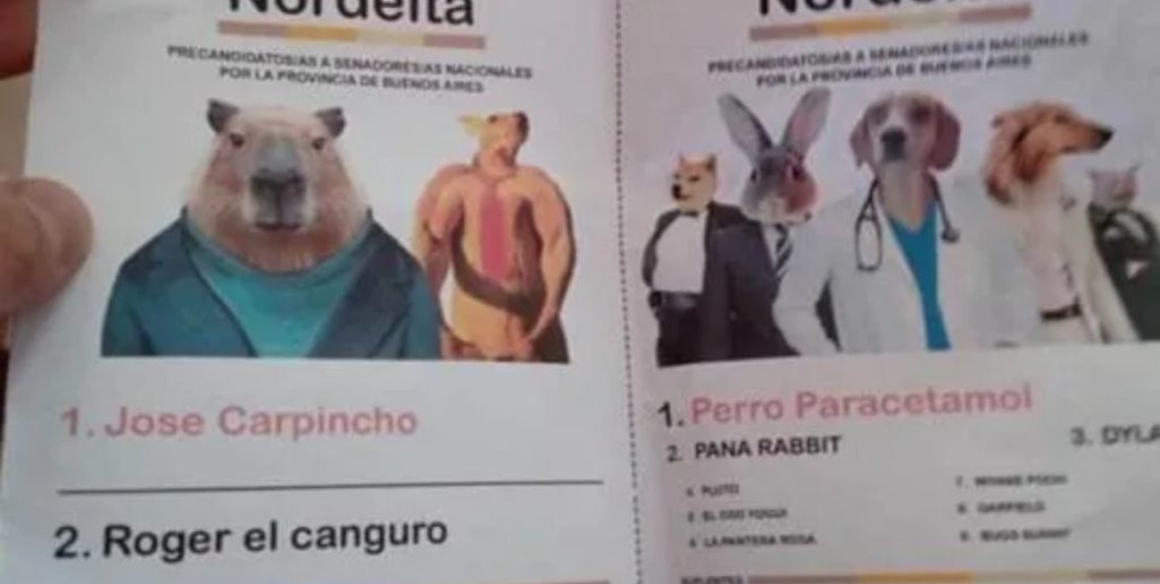 De todos modos, esa escuela no fue la excepción. En un colegio de La Piedad también apareció una boleta dominada por los carpinchos, esta vez de “Juntos por Nordelta”. Allí los principales candidatos eran “José Carpincho”, “Roger el Canguro”, “Perro Paracetamol”, el “Pana Rabbit”, Dylan, entre otros personajes.
